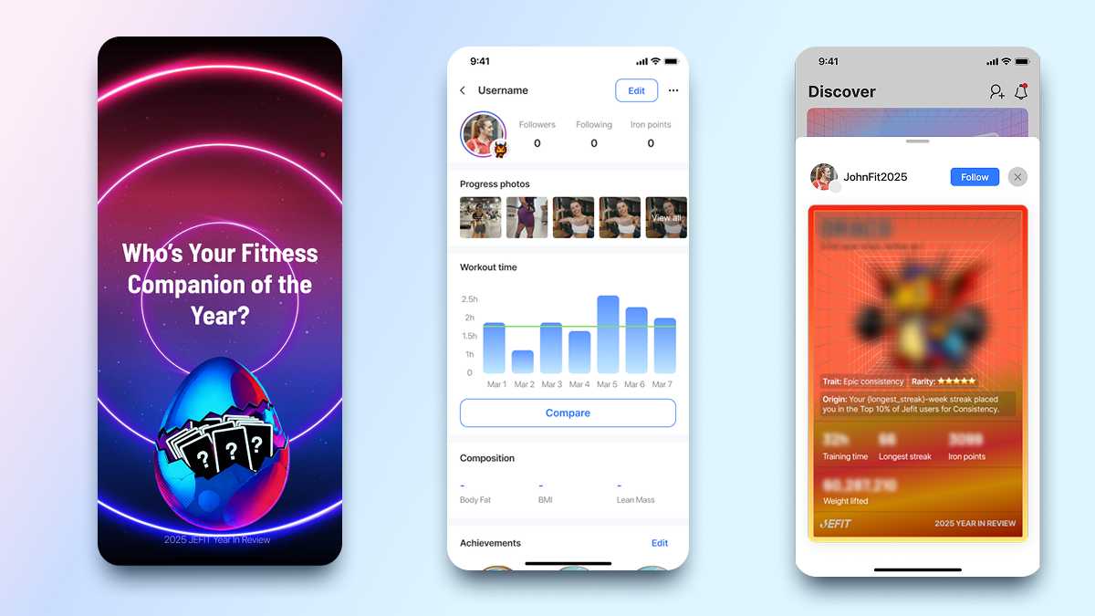 This year’s biggest reveal: JEFIT is introducing a new set of Companions, each representing a different strength you showed throughout 2025. Whether it was your consistency (longest streak), endurance (total training time), strength (total weight lifted), or achievement (total Iron Points earned), your Year in Review will match you with the companion that best reflects how you trained.